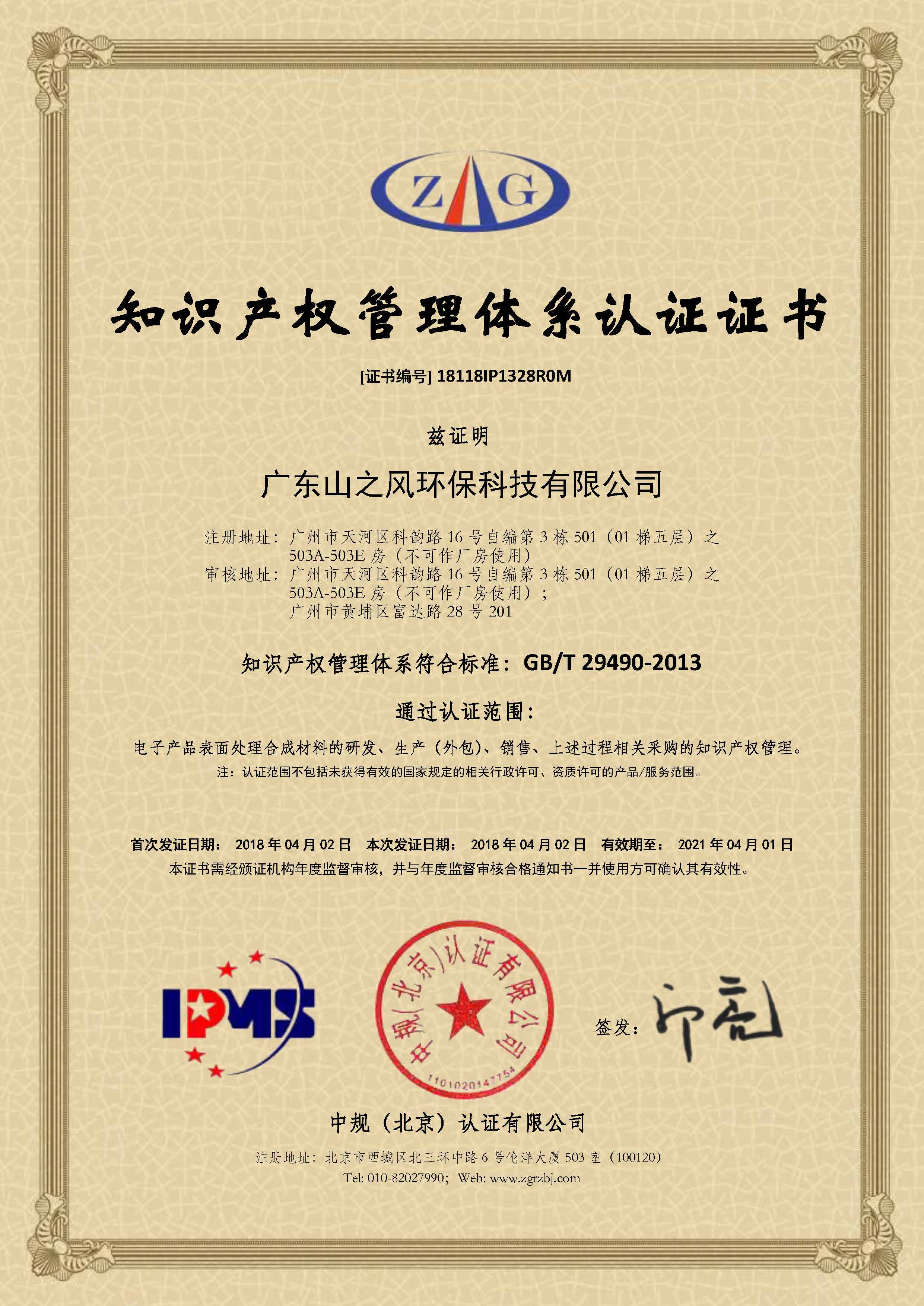 2018年4月3日,廣東山之風(fēng)環(huán)保科技有限公司憑借其規(guī)范完善的知識產(chǎn)權(quán)管理體系,喜獲國家《知識產(chǎn)權(quán)管理體系認(rèn)證證書》,標(biāo)志著廣東山之風(fēng)在知識產(chǎn)權(quán)規(guī)范化管理、運(yùn)用及風(fēng)險防范等方面邁上新臺階。